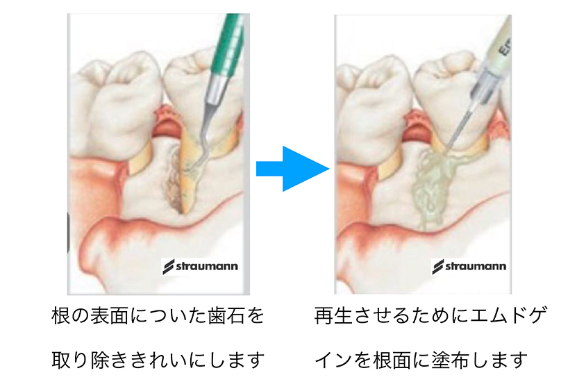 重度の歯周病によって破壊された歯周組織(歯を支える組織)を、エムドゲイン・ゲルという薬剤を使用して再生させる治療法です。