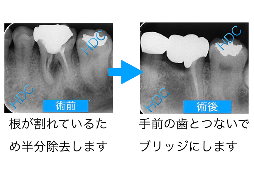 歯を完全に抜くのではなく、損傷した根とその上の歯冠(しかん:歯茎より上の部分)の一部のみを部分的に除去する「歯根分割抜去法(しこんぶんかつばっきょほう)」という術式です。